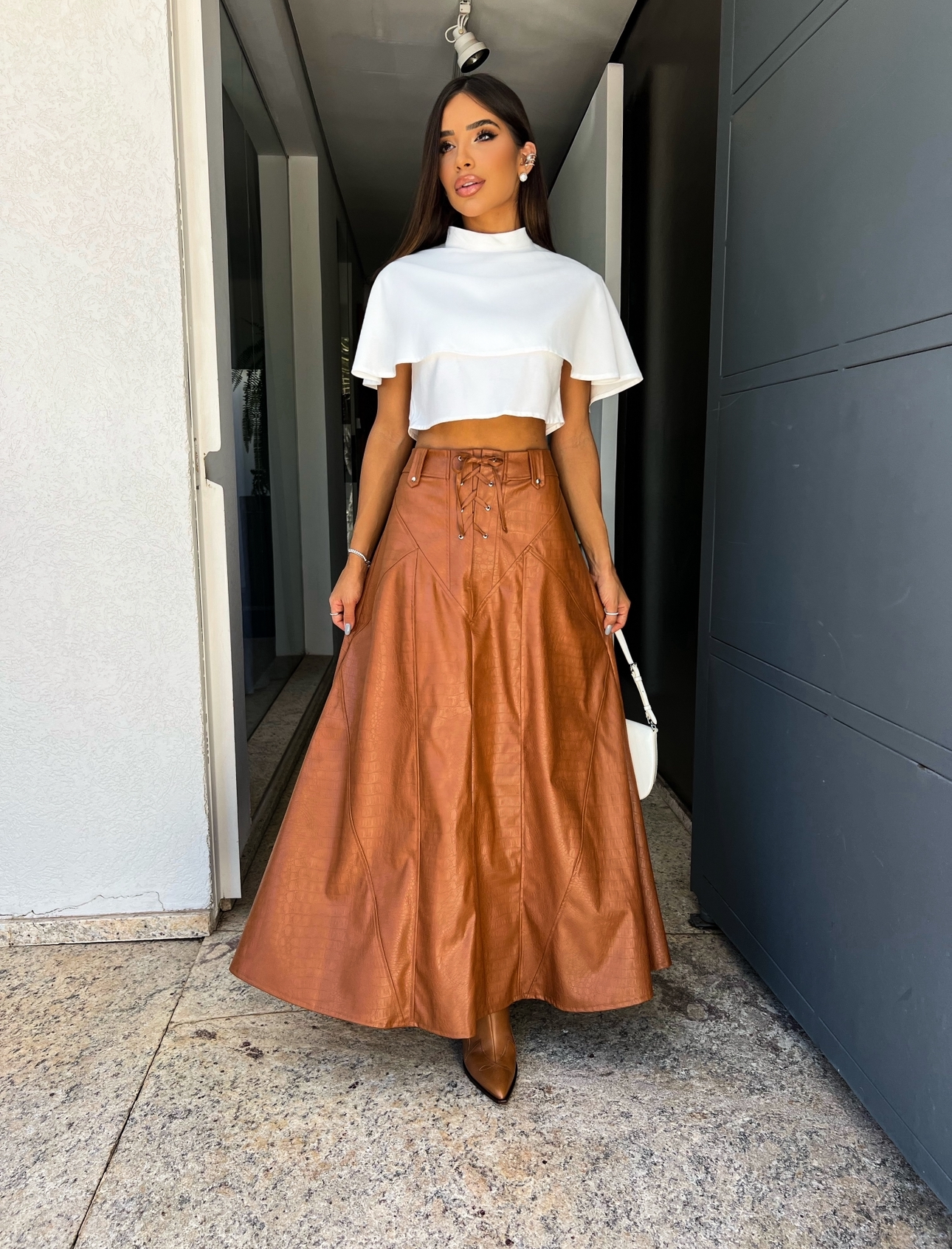 Saia longa evasê em couro P.U na cor caramelo, com fechamento em lace-up com recortes e ziper nas costas. Uma saia super versátil e atemporal!