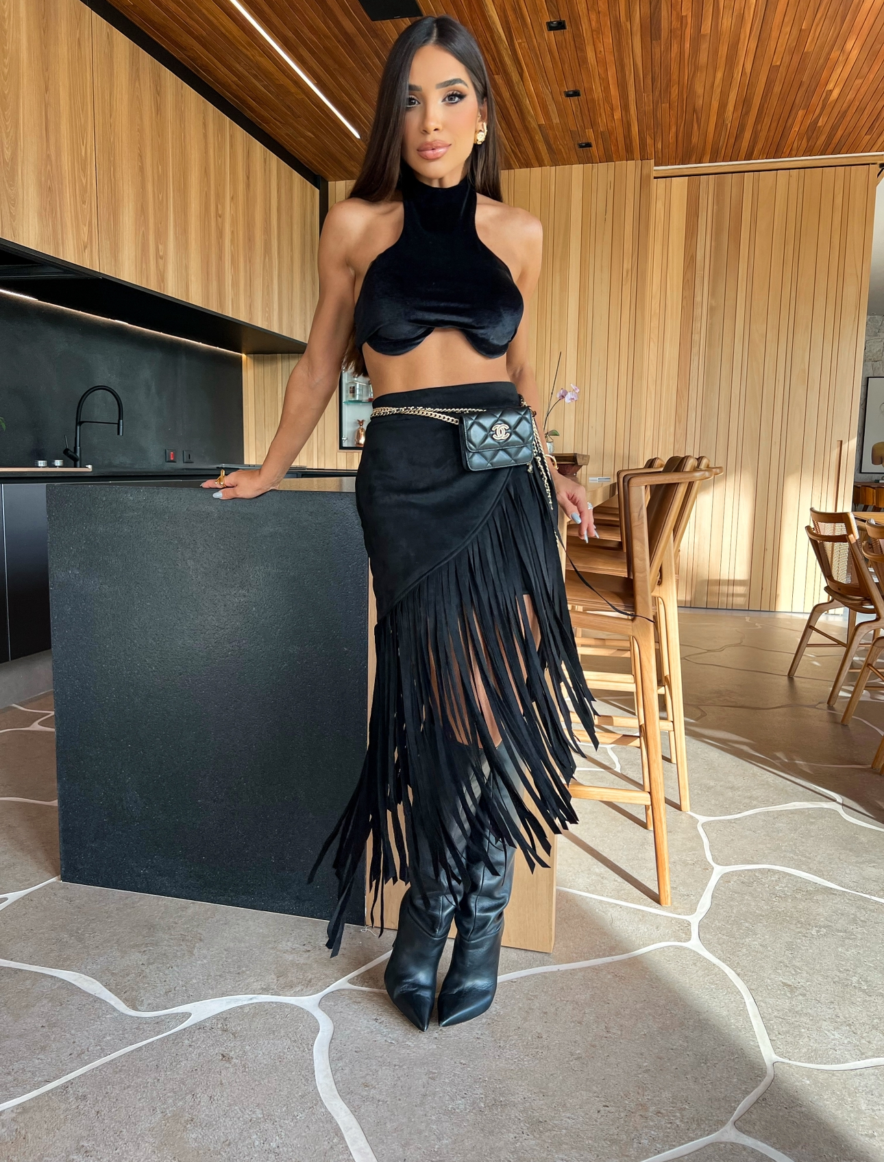 Saia midi de malha suede na cor preta, com franjas transversais, trazendo um movimento incrível para a peça. Fechamento em zíper invisível na parte das costas.