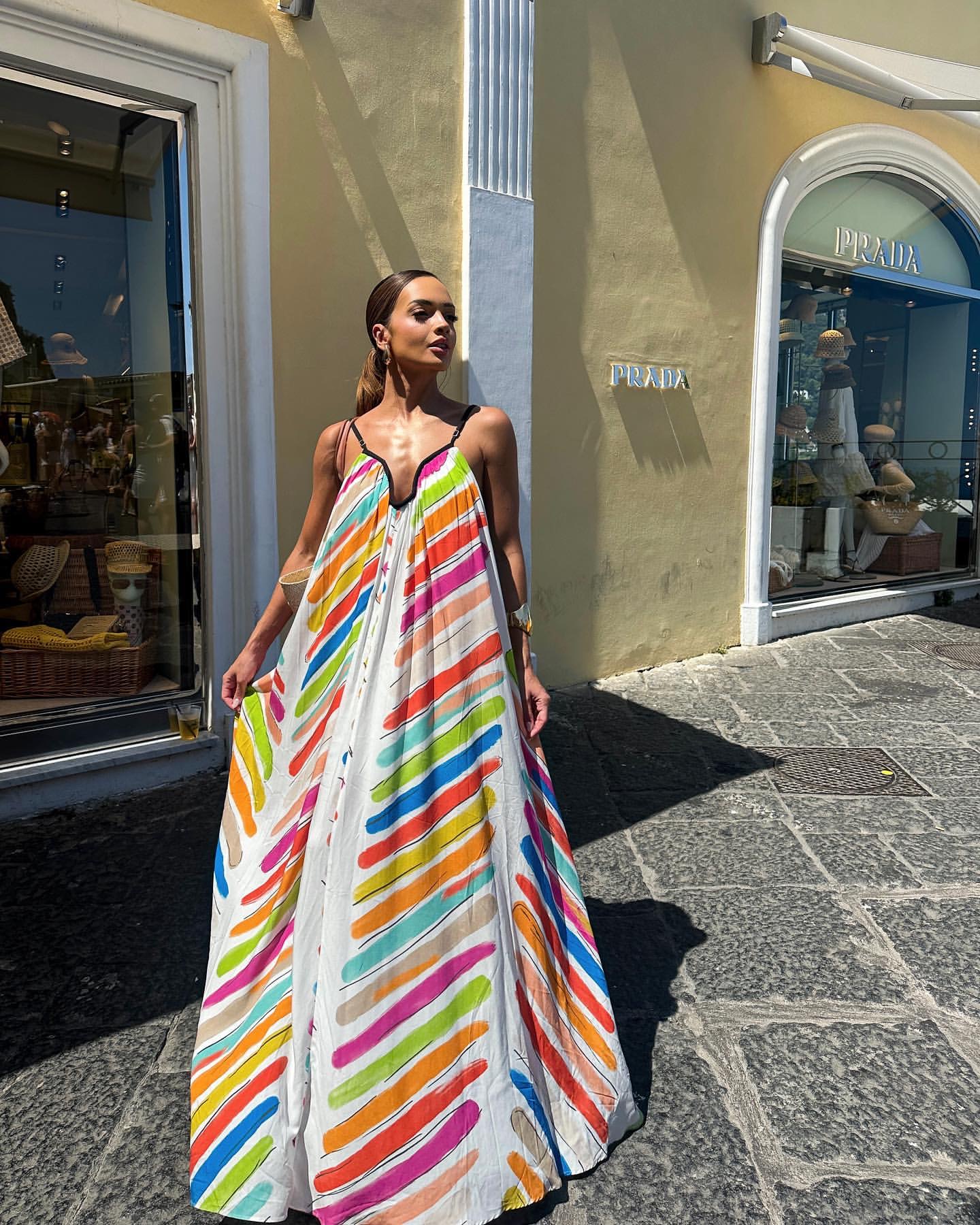 Um vestido fluido, mega especial, com aros no colo que estrutura o decote, ajuste nas alças, sem economia de tecido.